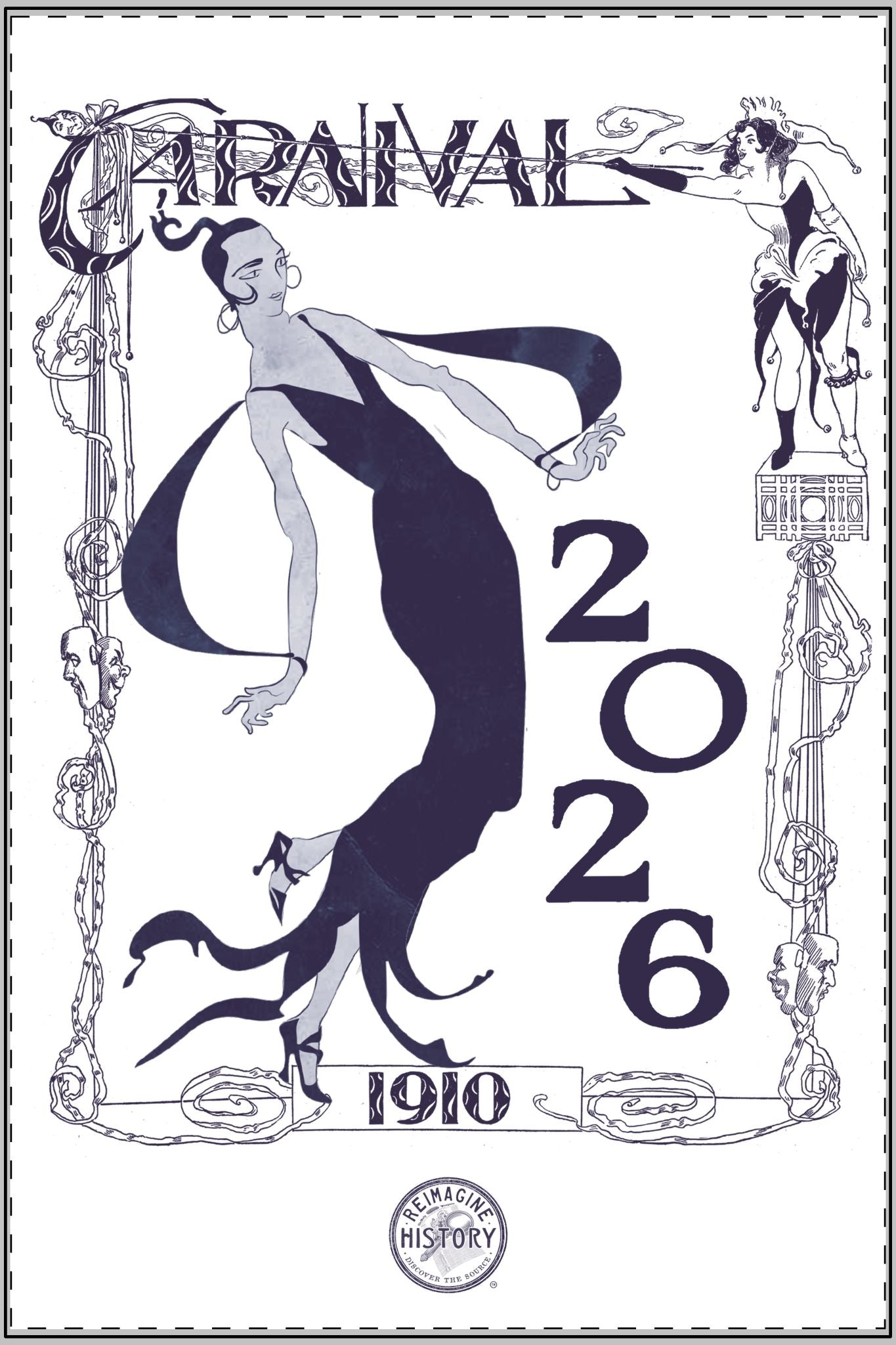 This early 20th-century newspaper illustration showcases the ornate design language and fashion of the era, offering visual insight into how Mardi Gras imagery was styled and idealized in the early 1900s. The figure’s elegant posture, detailed dress, and darker shading suggest themes of regality and elevated status, reflecting how Mardi Gras often portrayed royalty, pageantry, and spectacle through stylized illustration.