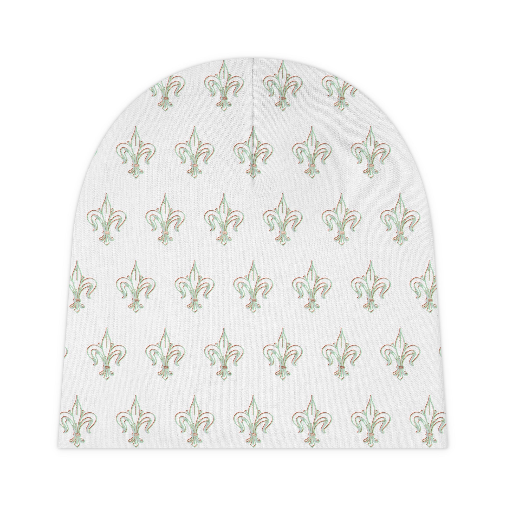 Our Holiday Collection features cards, apparel, and gifts created from vintage New Orleans print-shop graphics. After Hurricane Katrina, many mid-century and pre-1950s presses closed, leaving behind rare design books and illustration archives. Since 2007, we’ve salvaged materials from more than a dozen of these shops and transformed their artwork into archival-inspired holiday designs with a fresh, modern twist.This soft, stretch-knit baby beanie brings a touch of gentle elegance to everyday wear. The lightweight interlock polyester holds its shape while offering a comfortable stretch that slips on and off tiny heads with ease. A small, repeating gold fleur-de-lis pattern on a clean white background adds a refined, vintage-inspired charm that pairs well with nursery neutrals or dressed-up layers. Because the design prints on both sides, the look stays polished whether the hat is worn forward or slightly askew. Breathable and quick-drying, this beanie keeps newborns cozy during stroller walks, family photos, or quiet afternoons at home.