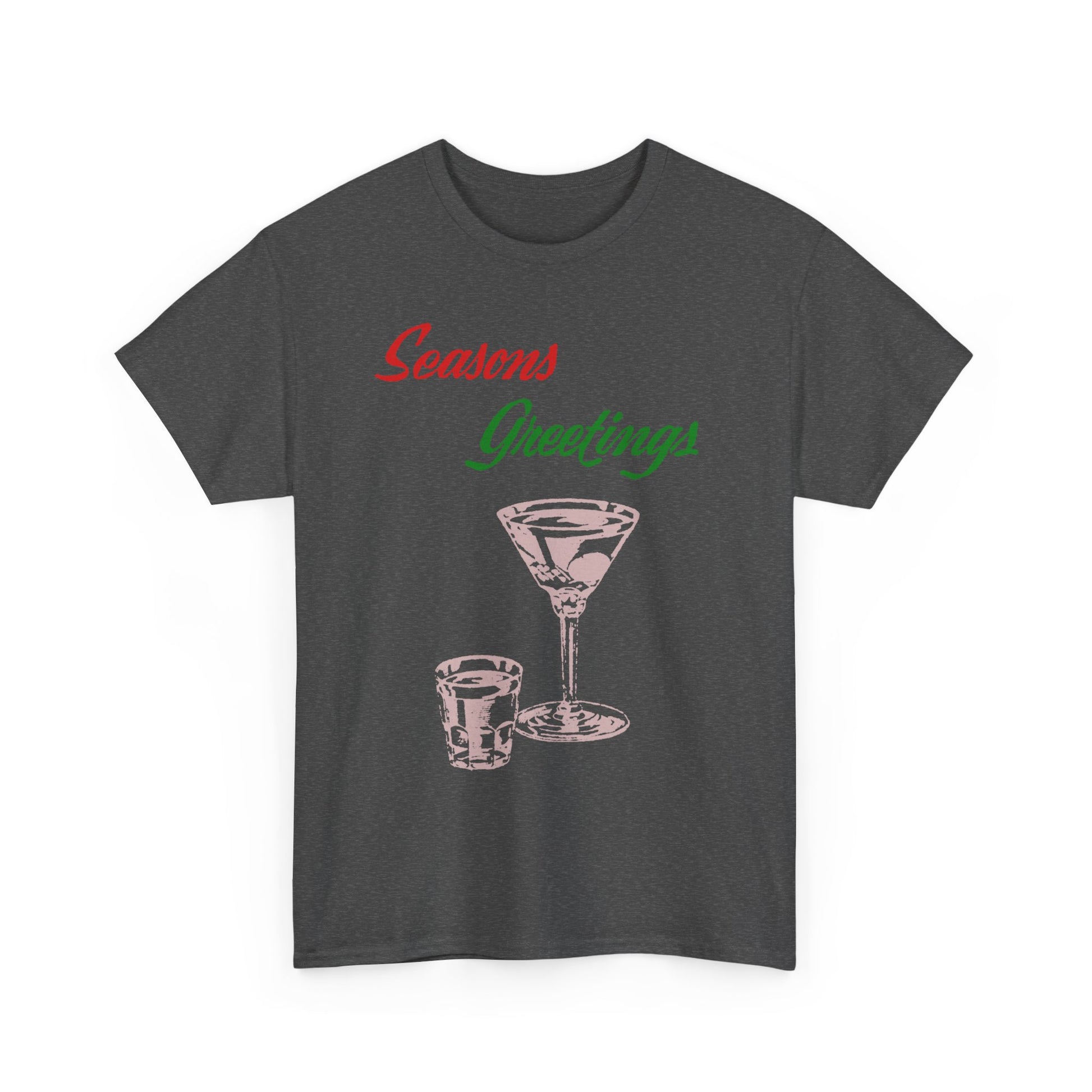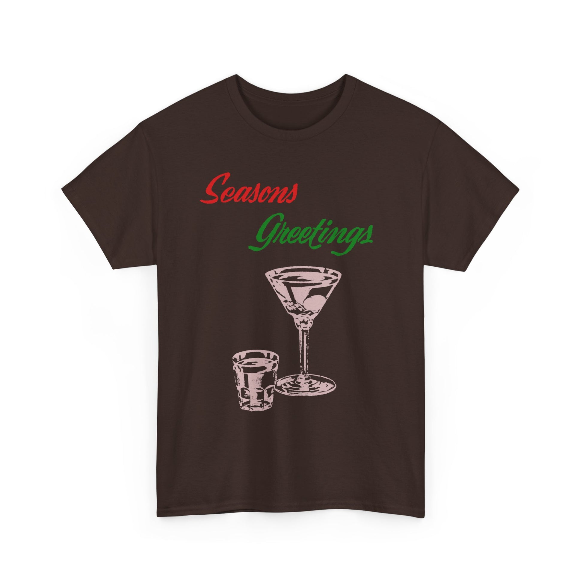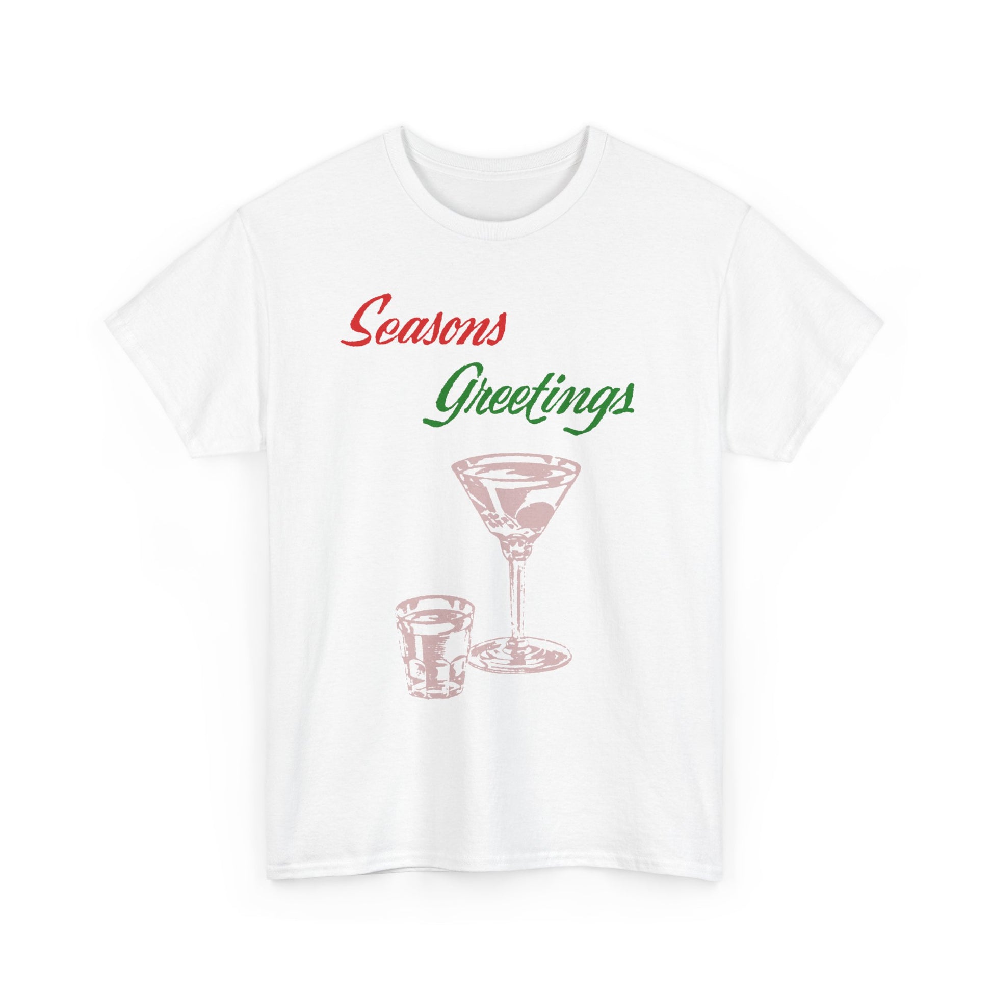 Raise a quiet glass to the warm, retro holiday nights with this soft, sturdy tee. The faded martini and shot glass illustration sits beneath hand-lettered “Seasons Greetings” in gentle red and green — like a postcard from a cozy gathering. The classic crew shape and relaxed fit let it layer easily over flannel or under a cardigan. Wear it to low-key holiday hangs, tree-lighting strolls, or while hosting friends for slow conversation and easy drinks. It feels familiar, slightly nostalgic, and made to be worn through many seasons of small celebrations.