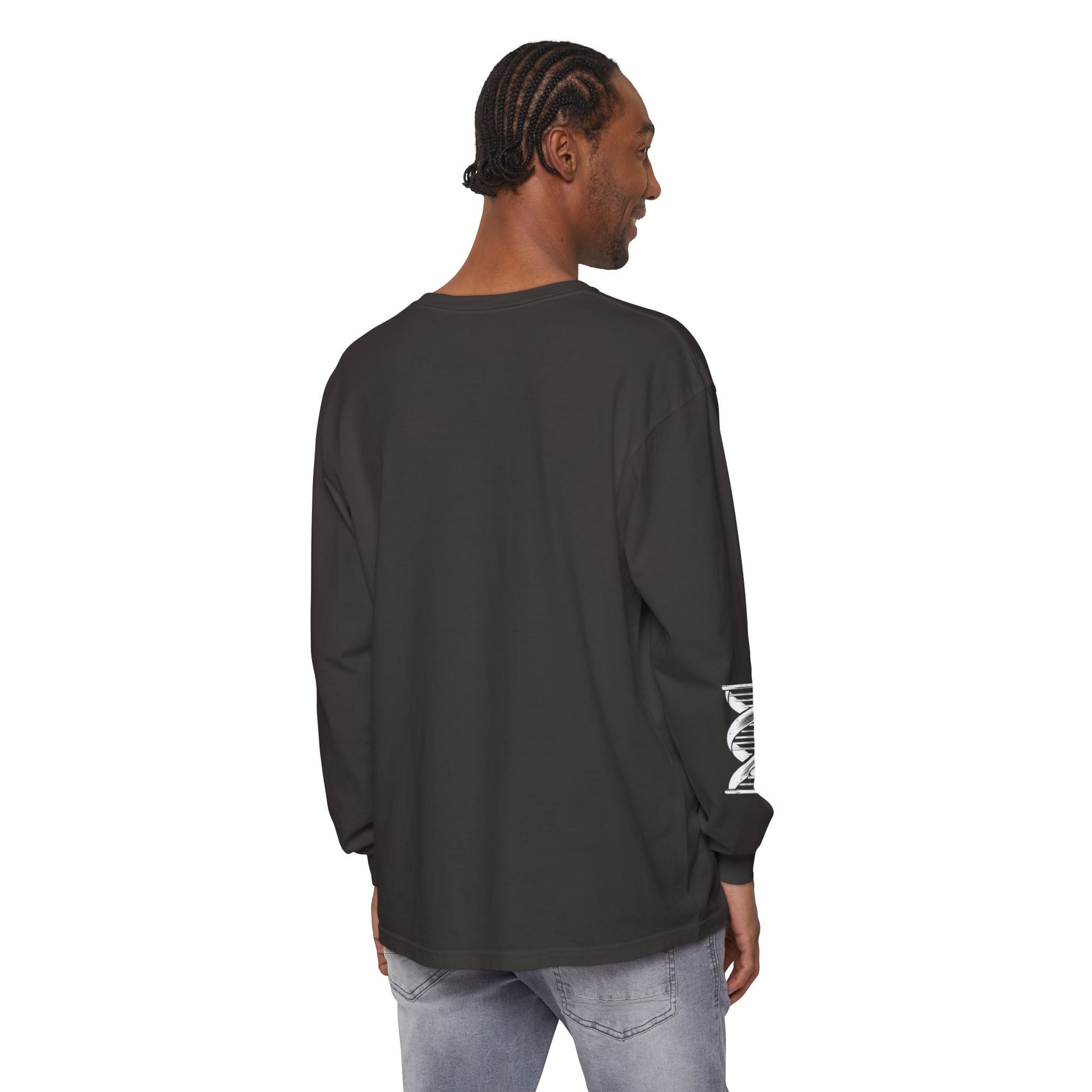 Lightweight, garment-dyed long sleeve made from soft ring-spun cotton with a relaxed, classic fit. The white long sleeve features a subtle, slightly distressed graphic with pale turquoise text that reads “word to the wise,” and a faint central illustration for a quiet, vintage vibe. Built for everyday wear, the ribbed-knit cuffs hold shape, while neck and shoulder twill tape keep the tee stable through repeated wear. It layers easily under jackets or pairs with jeans and worn-in sneakers for an effortless, lived-in look.